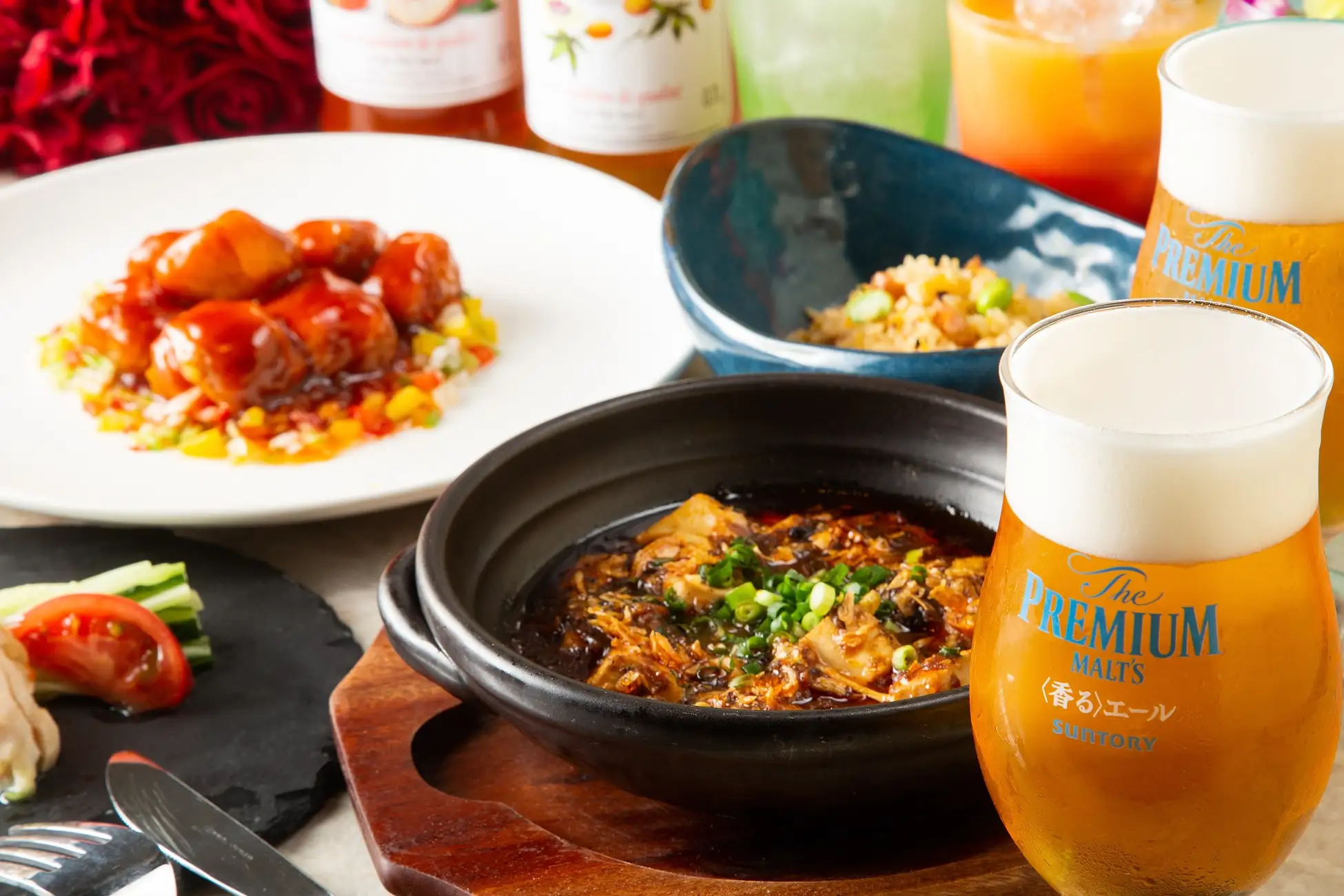 鶏モモ肉の油淋鶏~葱と生姜のソースがけ~、海老蒸し餃子、上海風麻婆豆腐、