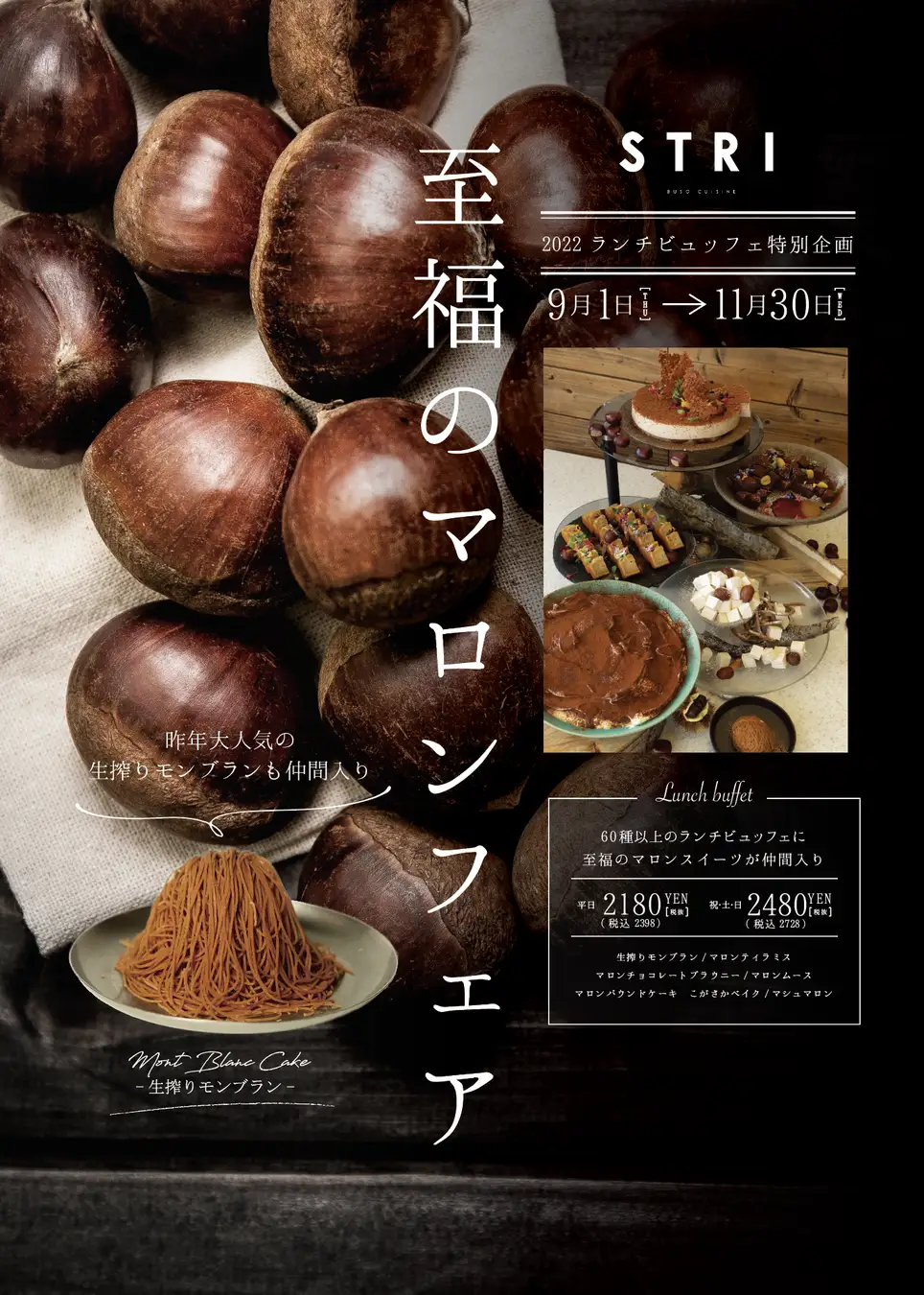 町田のルーフトップレストラン、『STRI(ストリ)』(運営:株式会社キープ・ウィルダイニング、本社:東京都町田市)は、ランチビュッフェの秋企画として《至福のマロンフェア》を2022年9月1日〜11月30日まで開催いたします。地元町田の野菜を取り揃えたサラダビュッフェや、系列店の「こがさかベイク」で焼き上げた自家製パンなど、60種類以上の本格料理と秋だけの濃厚栗スイーツを取り揃えております。
