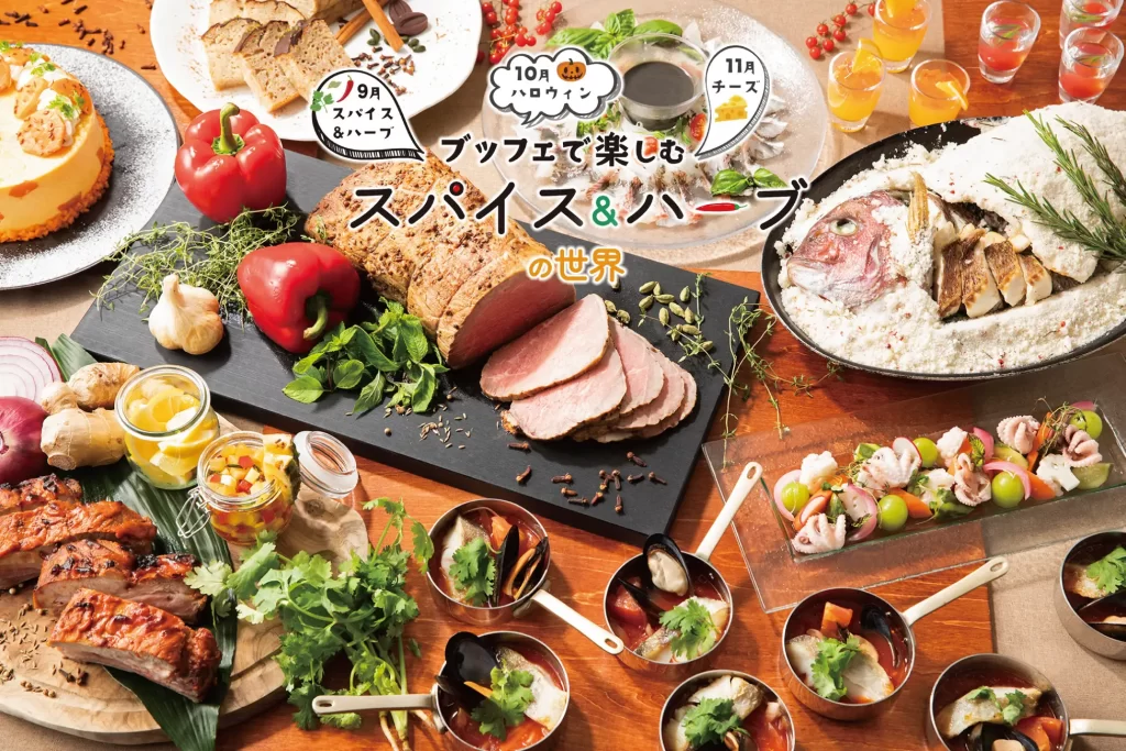 毎月趣向を凝らしたブッフェを堪能できる本フェアでは、第一弾として『ブッフェで楽しむスパイス&ハーブの世界』をご用意。世界最古のスパイスの1つとされる“コリアンダー”や爽やかな風味が特徴の“タイム”など30種類以上を使用した料理を召し上がりいただけ、「暦の上では秋、暑さが残る季節にスパイス・ハーブの料理で残暑を乗り切って欲しい」というシェフの思いが込められています。