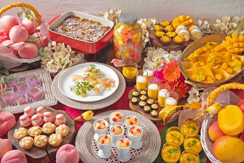 夏の夜を鮮やかに彩るスイーツは、マンゴーと桃の組み合わせです。約10種類のスイーツがのった特製プレートをお席までお持ちします。さらに、スイーツがのったワゴンが登場!好きなものをお好きなだけお選びいただけます。