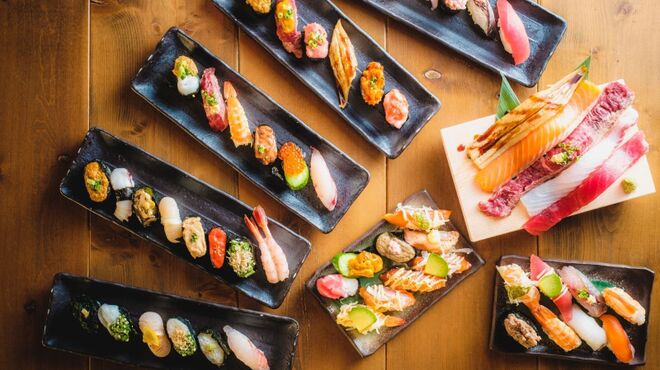 当店の目玉商品は、バラエティ豊かなお寿司をお腹いっぱいお召し上がりいただける“お寿司の食べ放題”です。通常サイズのお寿司の他、素材の味がより楽しめる20㎝超のネタが乗った、インパクト抜群な見た目で思わず写真を撮りたくなるような「大ネタ寿司」が各種ご堪能いただけます。お寿司以外にも、居酒屋定番のおつまみもお召し上がりいただけますので、最後まで飽きることなく食べ放題をお楽しみください。