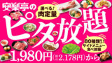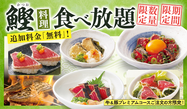 食べ放題牛&豚プレミアムコース以上をご注文で、今が旬の炭火焼「鰹のたたき」などの鰹(かつお)料理が追加料金無料で食べ放題になります。(期間限定・数量限定です。)