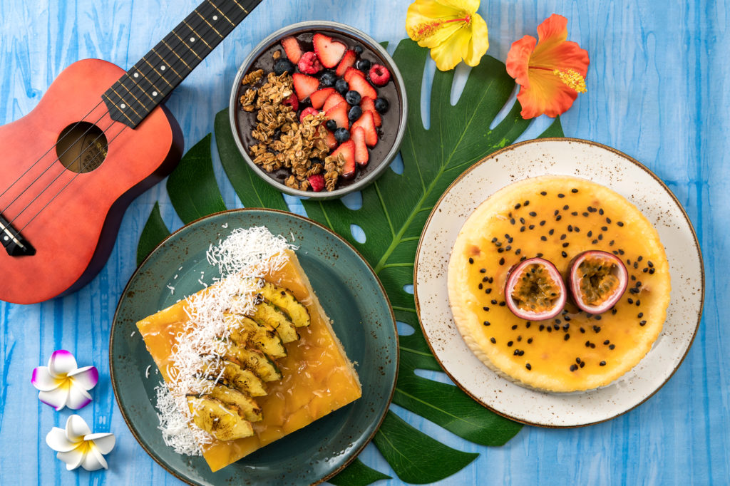アサイーボール、パイナップルココナッツケーキ、パッションフルーツチーズケーキ など