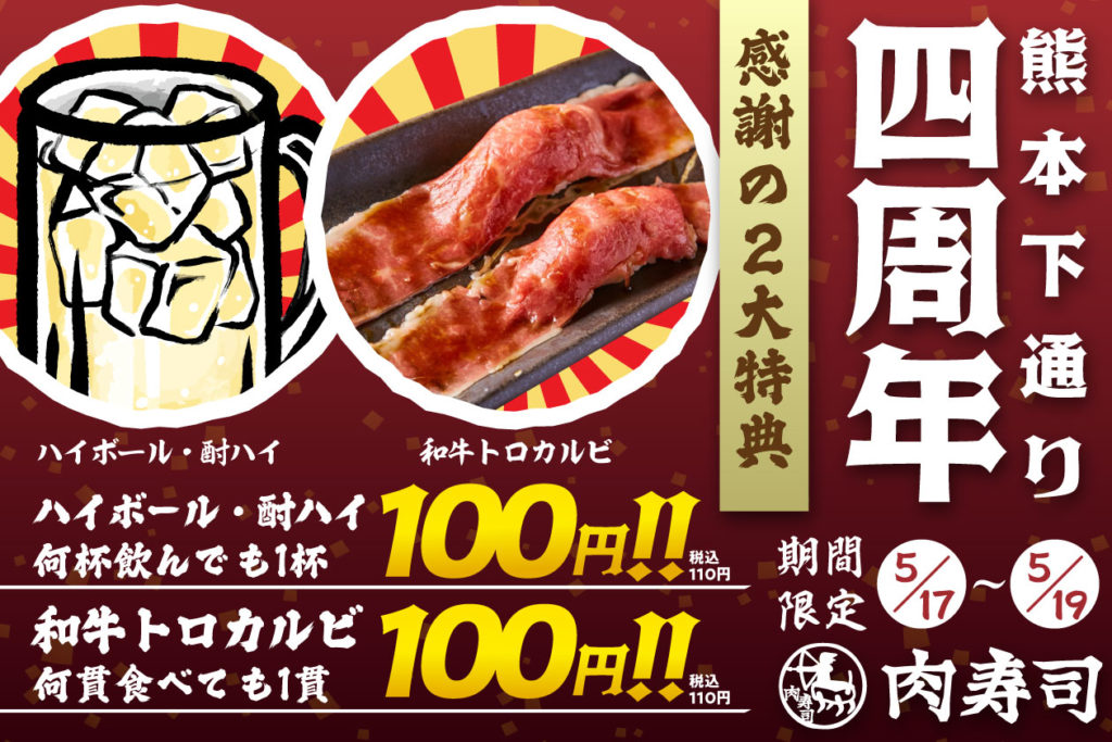 ”寿司×肉”で人気を博す居酒屋『熊本下通り 肉寿司』は、オープン4周年を記念して、2022年5月17日(火)~19日(木)の期間限定で、【①ハイボール、酎ハイを何杯飲んでも1杯100円(税込110円) ②和牛トロカルビを何貫食べても1貫100円(税込110円)】となる”どちらも使えるWキャンペーン”を実施いたします。