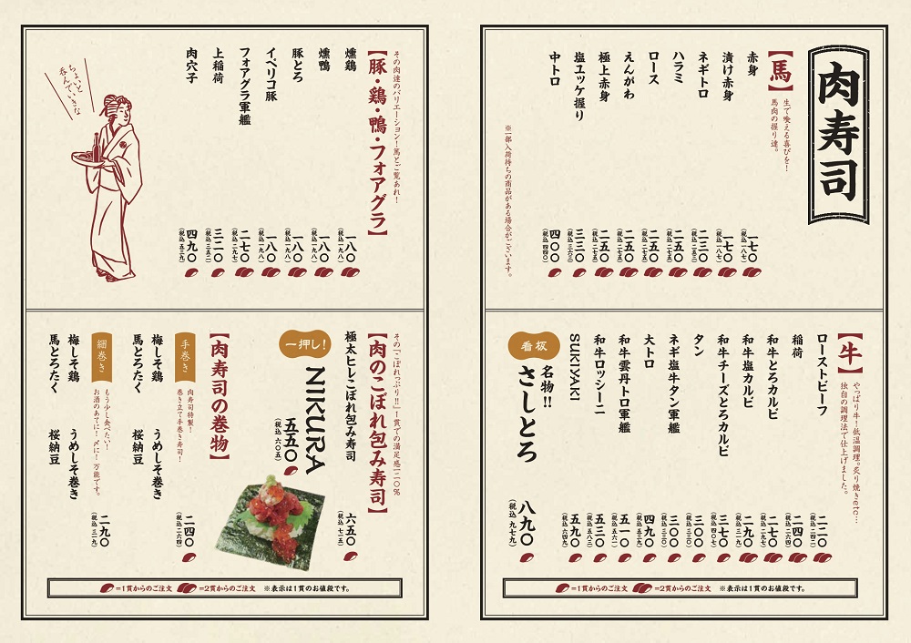 屋台の寿司屋に馬肉をはじめとする肉をネタに使って誕生したのが『肉寿司』です。