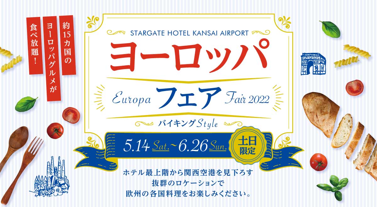 関西国際空港の対岸にある地上256mの超高層ランドマークタワー、スターゲイトホテル関西エアポートは、54階 ダイニング&バー「スターゲイト」にて、欧州の各国グルメが食べ放題の「ヨーロッパフェア」を2022年5月14日(土)~6月26日(日) の土・日曜日限定で開催いたします。イタリアのカプレーゼやトリッパのトマト煮込み、スペインのトルティージャやパエリア、イギリスのフィッシュアンドチップスなど約15か国のヨーロッパグルメが食べ放題。人気のシェフズコーナーでは焼きたてステーキ*や濃厚チーズリゾットをご提供いたします。また、ティラミスやタルトシトロンなどのヨーロッパ伝統スイーツもお薦めです。