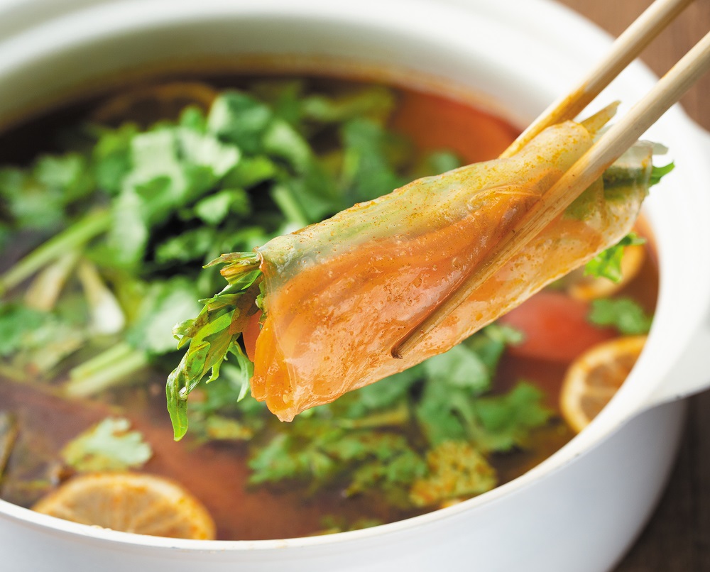 こだわりは、本場の味に近づけながらも、肉と魚介がマッチする絶妙なバランスのスープに仕上げた点です。王道トムヤムクンの味をベースに、塩味と甘味のバランスを細かく調整し、肉を入れることを想定した配合にすることで、しゃぶしゃぶとして楽しめるトムヤムクン鍋に仕上げました。