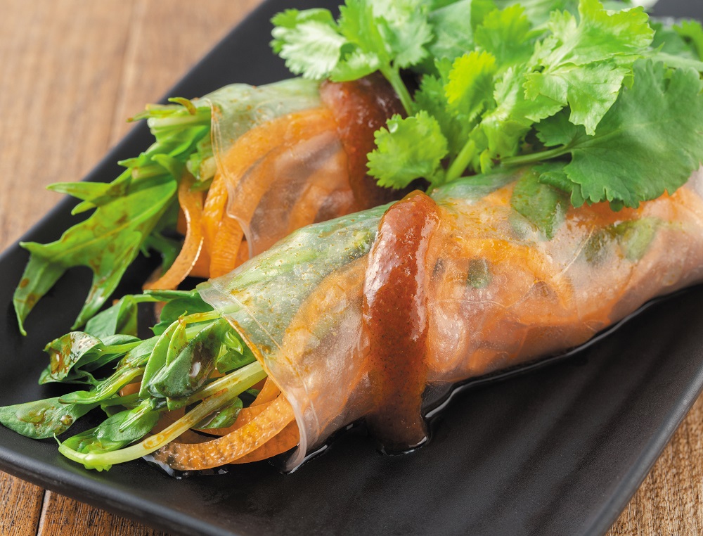 水菜、人参、パクチーをライスペーパーで巻き、エスニックソースを合わせた一品