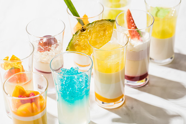 マカデミアナッツのブラウニー、ハイビスカスとスイカのゼリー、ふわふわでモチモチのトロピカルフルーツの台湾カステラ、パイナップルとココナッツのピニャコラーダなどスイーツが約20種類お楽しみいただけます。