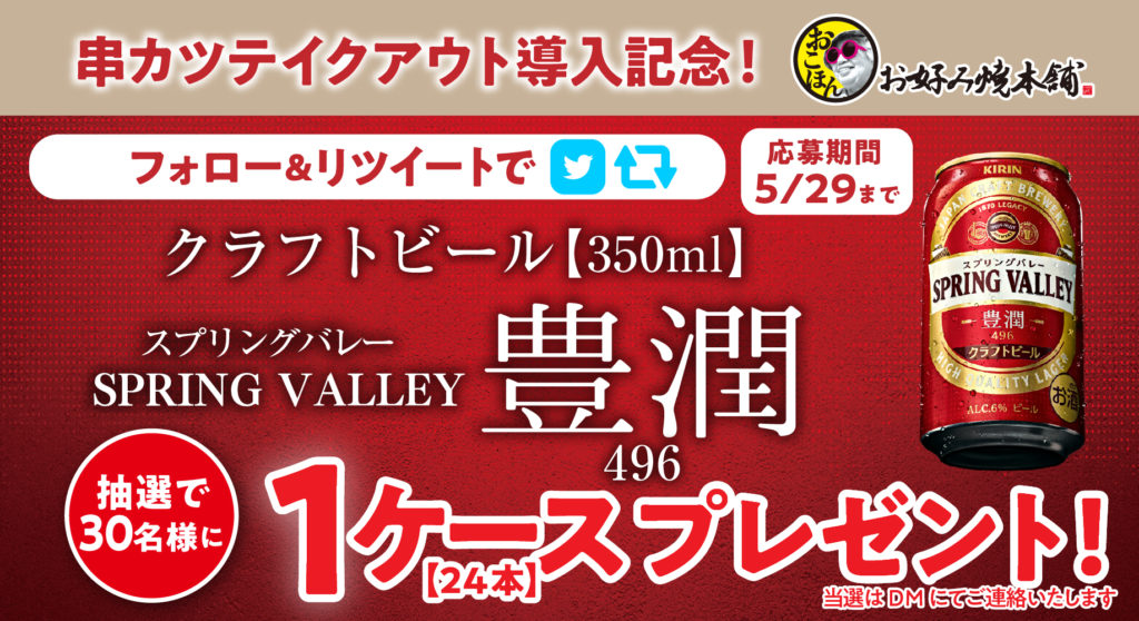 株式会社物語コーポレーションは、全国26店舗展開中の『お好み焼本舗』は、串カツ全品テイクアウト販売開始を記念して、2022年5月18日(水) より「SPRING VALLEY 豊潤<496>」が当たるTwitterフォロー&リツイートキャンペーンを開催いたします。
