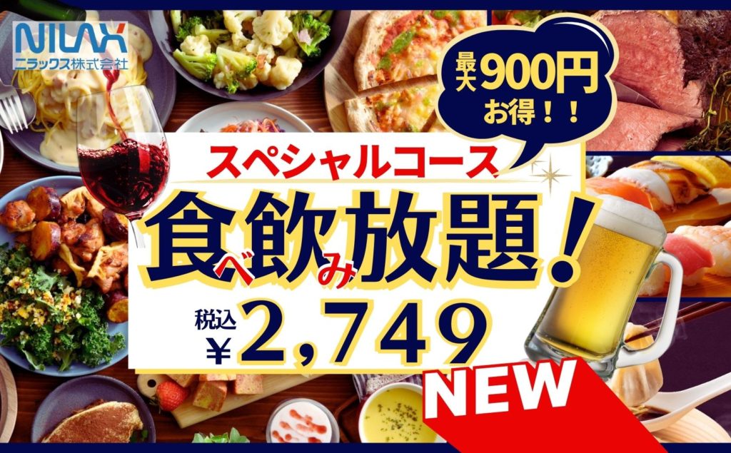 食べ放題のテーマパーク、 ニラックス株式会社が運営する『グランブッフェ』『フェスタガーデン』などのブッフェレストラン13店舗にて、通常価格よりもオトクにスペシャルコースとアルコール飲み放題が堪能できる『食べ飲み放題コース』が新登場!