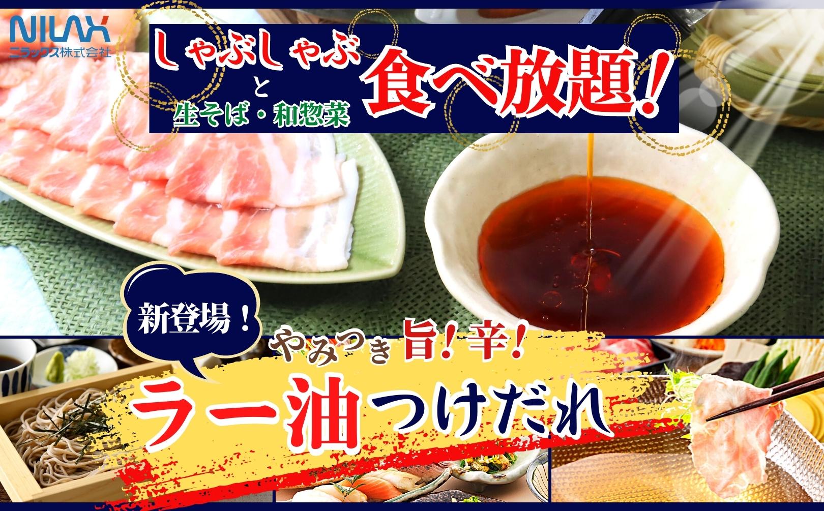 ラー油の辛味とごま油のコクを効かせた、これからの季節にピッタリな『ラー油つけだれ』は、食べると絶対くせになるやみつきだれ!沢山のお野菜と三元豚バラ肉・三元豚肩ロース肉がすべて食べ放題で味わえる『しゃぶしゃぶ』のたれとしてはもちろん、のど越しの良い風味豊かな『生そば』や『うどん』などにも最適!