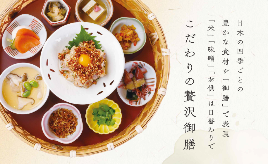ご好評いただいておりましたビュッフェは「デザートビュッフェ」という形で一部スタイルで残しつつ、お料理は店内精米のお米を使った日替わりのご飯とお味噌汁に、お魚・お肉などのメイン料理のほか、ご飯に合う「お供」をつけた御膳スタイルでご提供いたします。
