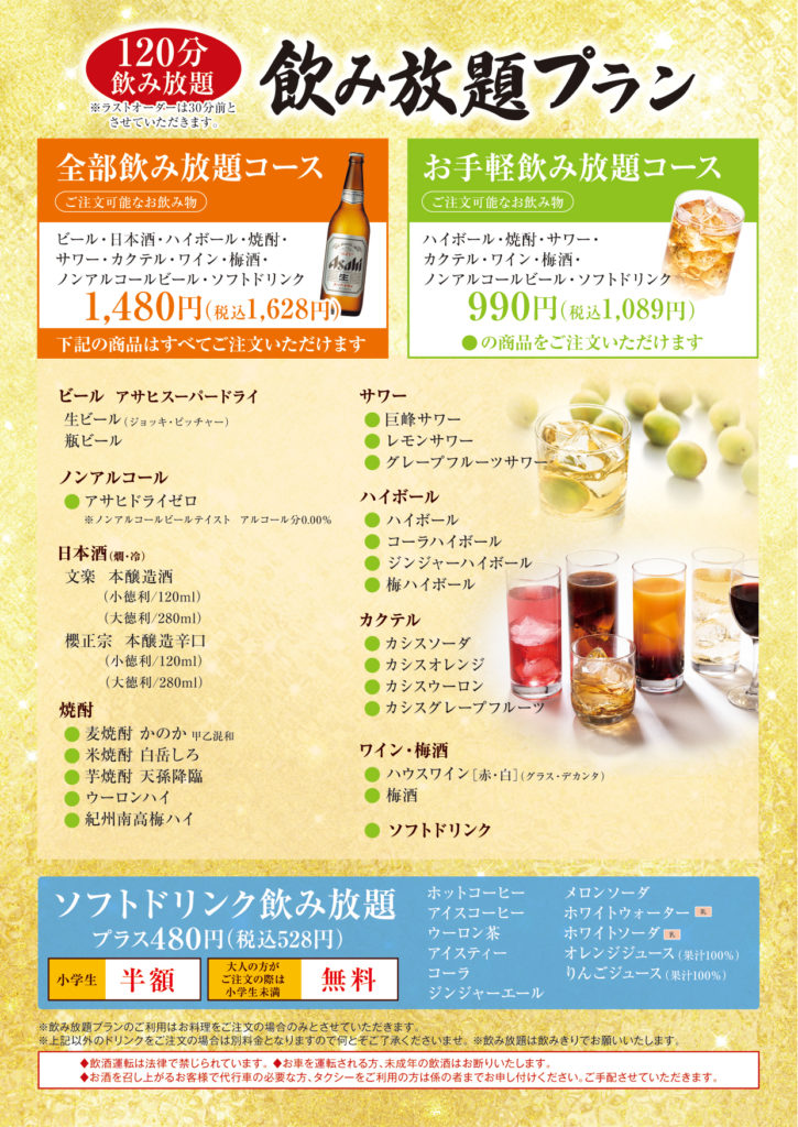 いずれも120分飲み放題、ラストオーダー90分で全3コースをご用意しております。