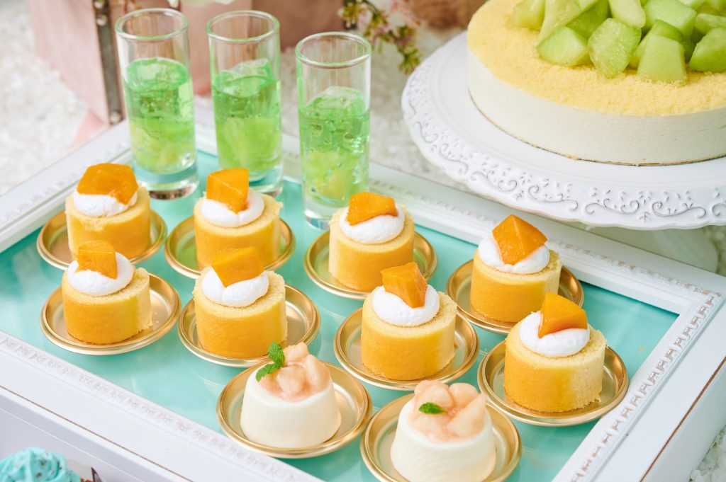 メロンがたっぷりとデコレーションされた宝石のようなタルトやチーズケーキ、ギフトボックスをかたどったメロンショートケーキなど、見た目にも華やかなスイーツがビュッフェボードを彩ります。