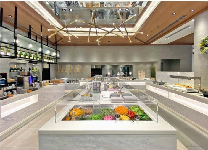 新鮮な地元野菜、目の前で切り分けられる肉料理、パティシエこだわりの自家製スイーツなど、多彩な料理をビュッフェスタイルで提供する洗練された、気兼ねなく過ごせるダイニング。
