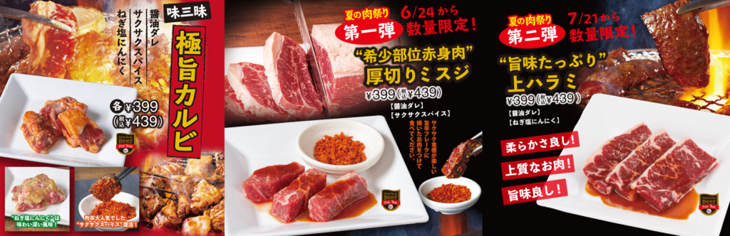 6/24(木)からスタートする第一弾には、“希少部位赤身肉”の「厚切りミスジ」が登場。サクサク食感が美味しい旨辛の「サクサクスパイス」を付けてお召し上がりください。7/21(水)からスタートする第二弾には、“旨味たっぷり”の「上ハラミ」が登場。柔らかく上質なお肉をご堪能ください。どちらも期間限定&数量限定なので、ぜひお見逃しなく!