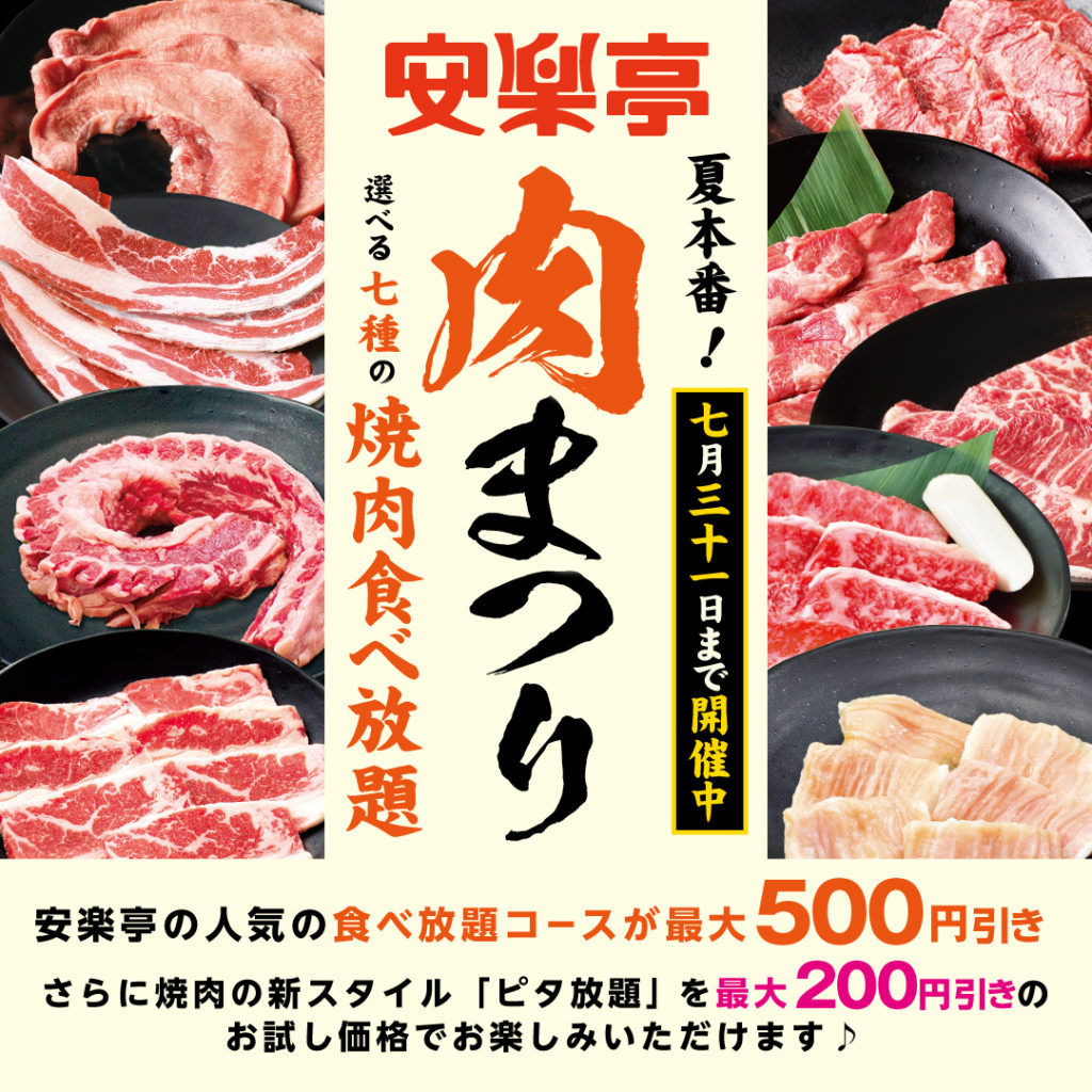 株式会社安楽亭が運営する「焼肉レストラン 安楽亭」では、この夏、皆様が焼肉を思う存分楽しんでいただける「夏本番!焼肉食べ放題『肉』祭り!」を好評につき7月31日(日)まで延長することとなりました。