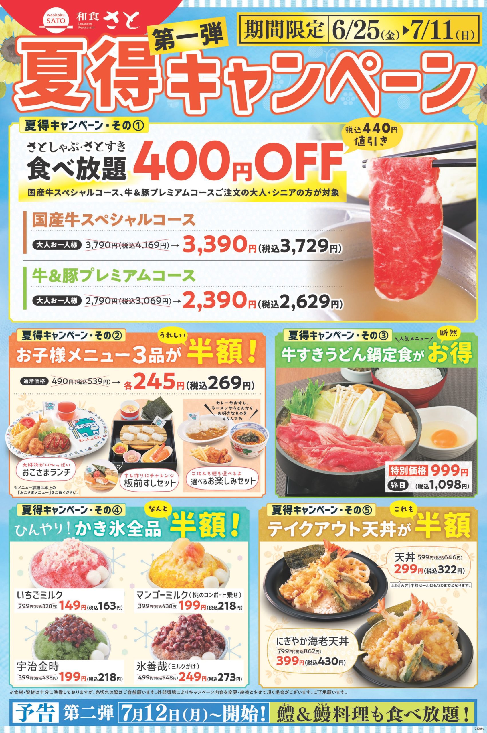国内206店舗を展開する「和食さと」では、6月25日(金)~7月11日(日)の期間限定で、食べ放題メニューやかき氷、テイクアウトメニューなど5つのジャンルでお得に楽しめる『夏得キャンペーン』 を開催します。