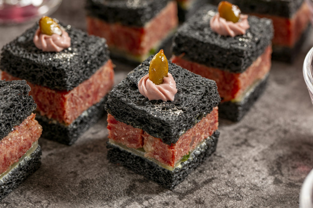 真っ黒なパンにビーフパテときゅうりのピクルスを挟んだサンドウィッチ。キャラメリゼしたパンプキンシードをトップにあしらいました。