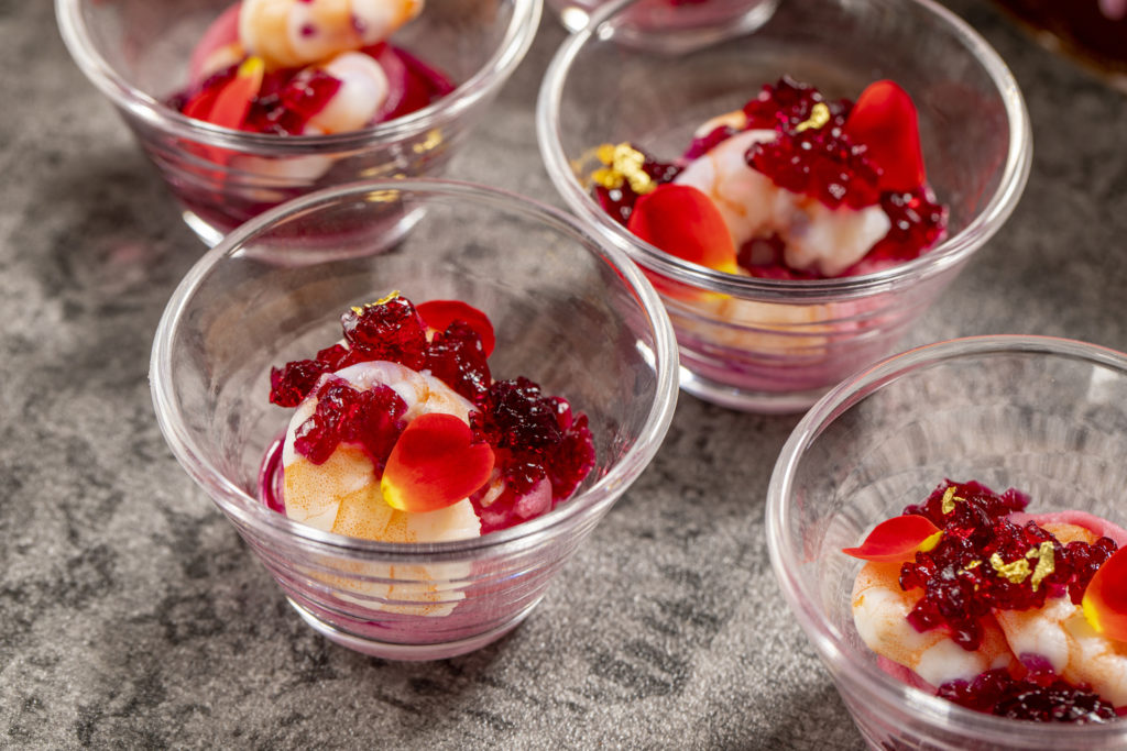まるで宝石のように赤く輝く紫野菜をシュリンプカクテルに合わせ、ロブスターコンソメで仕上げた見目麗しいセイボリー。