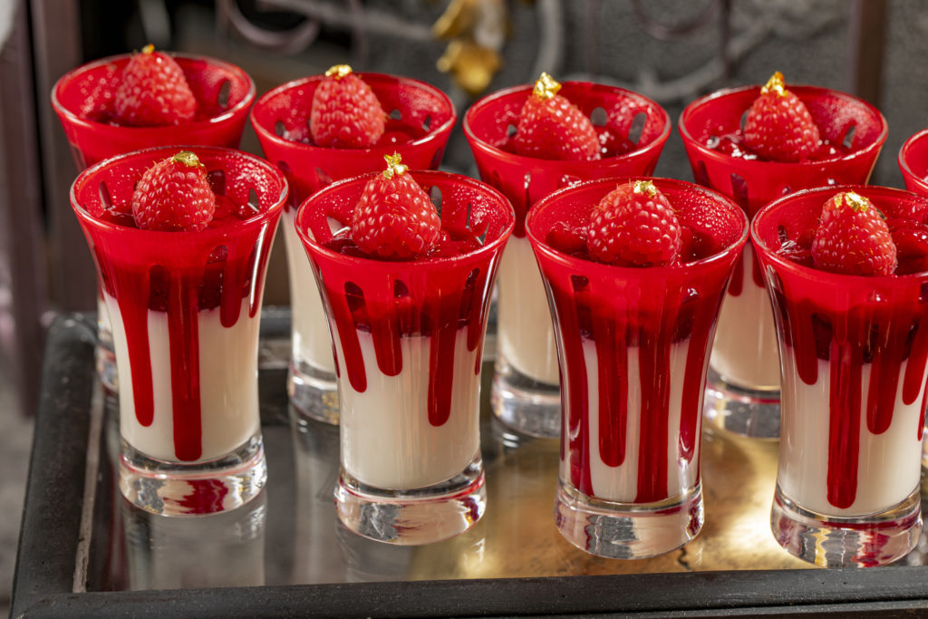 バニラが香るパンナコッタに真っ赤なラズベリーゼリーを重ねました。グラスを滴る赤いチョコレートがハロウィンの気分を盛り上げます。