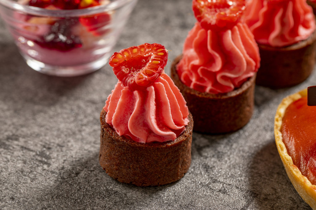 カシスとチョコレートが好相性のタルトに、ラズベリーのクリームをフリルのように絞り、フレッシュラズベリーをトッピングしました。
