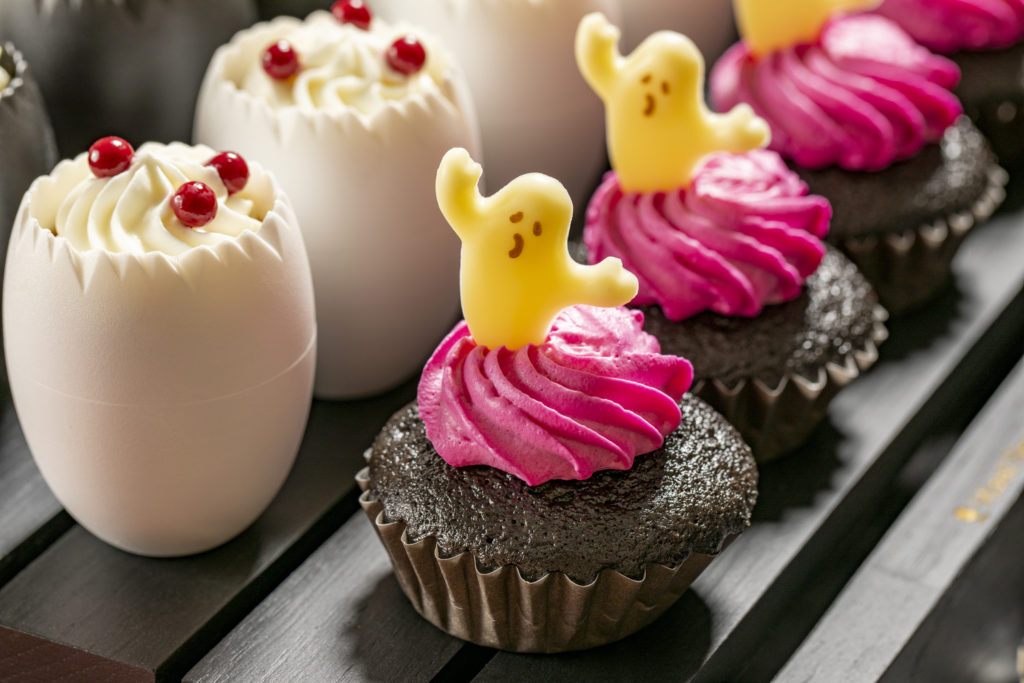 ハロウィンらしさ溢れる真っ黒なビターチョコレートのカップケーキにバナナを忍ばせ、ショッキングピンクのクリームを絞りました。クリームからゴーストが可愛らしくご挨拶。