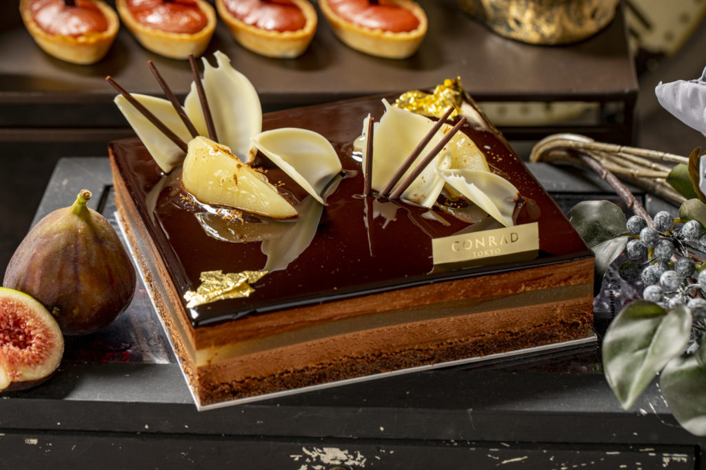 濃厚なキャラメルチョコレートのムースの上に洋ナシのゼリーが入った香り高いムースを重ね、チョコレートでミラーコーティング。トップをエレガントなホワイトチョコレートの飾りとともに釘のようなチョコレートでドレスアップ。