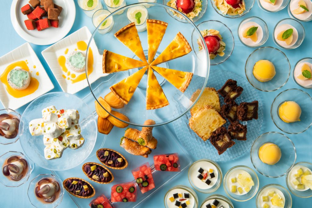 ガトーショコラ/チュロス/ティラミス/ココナッツマカロン/パインアップルタルト/ホワイトチョコレートと抹茶のテリーヌ/ラムネジェラート/フレッシュフルーツ ほか全15種