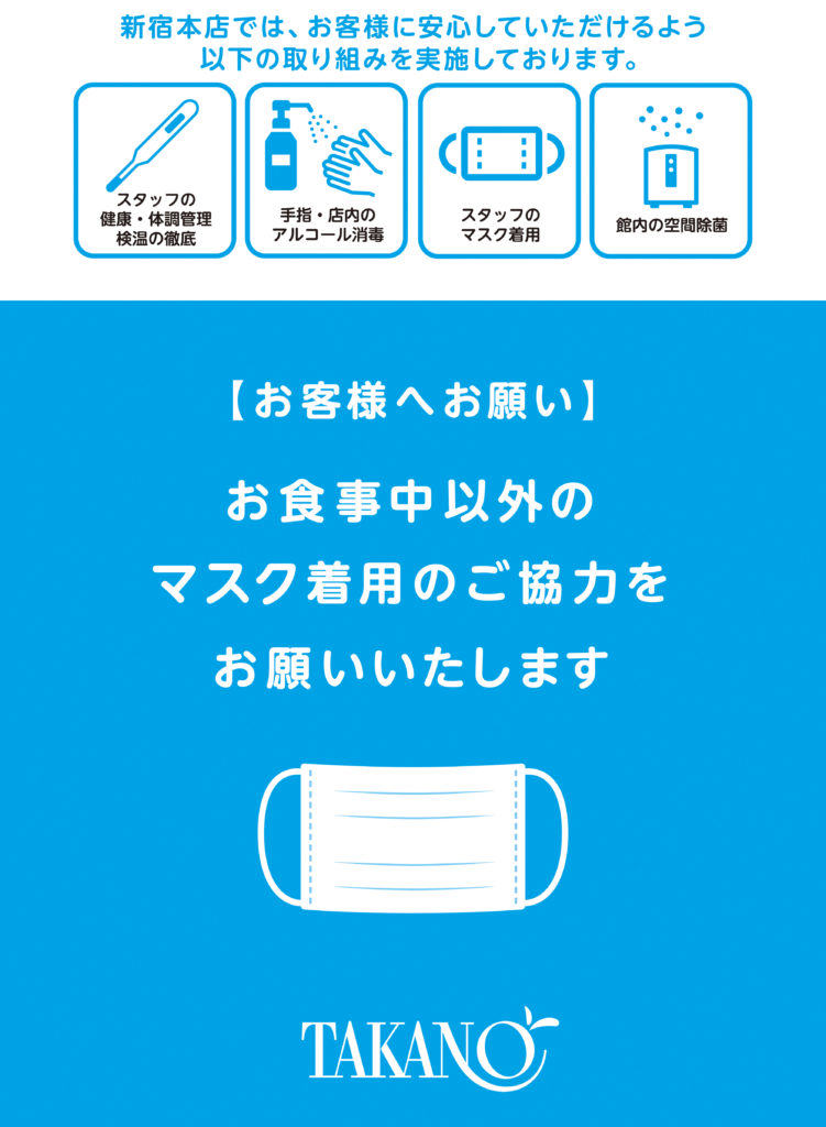 タカノフルーツティアラでは、お客様と従業員の安全と健康を最優先とし、下記の感染拡大防止策を実施しております。