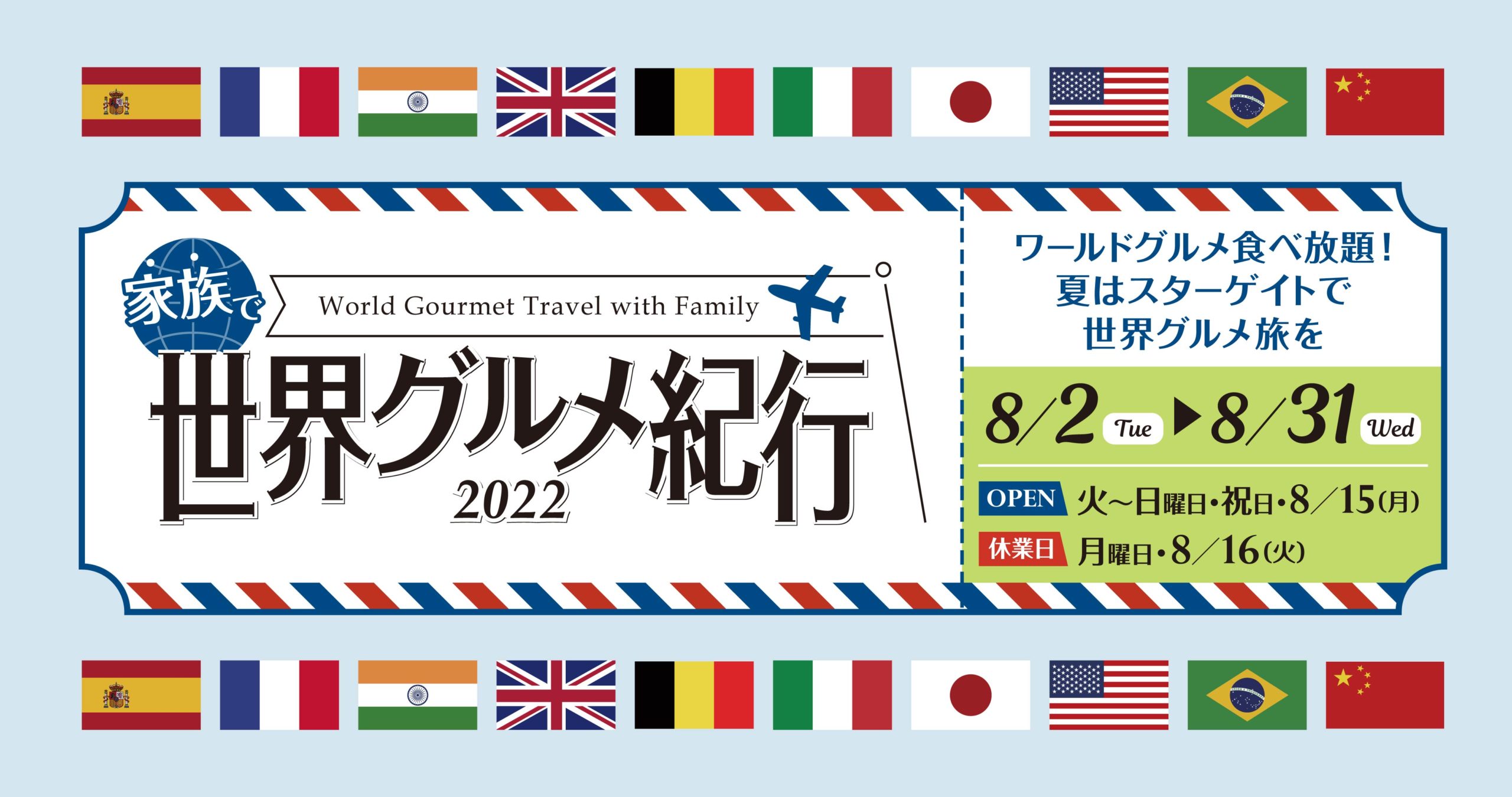 関西国際空港の対岸にある地上256mの超高層ランドマークタワー、スターゲイトホテル関西エアポートは、54階 ダイニング&バー「スターゲイト」にて、ワールドグルメが食べ放題の「家族で世界グルメ紀行2022」を2022年8月2日(火)〜8月31日(水)の火〜日曜日・祝日、8月15日(月)に開催いたします。彩り鮮やかなフランス寿司やイギリスのフィッシュアンドチップス、アメリカのオープンサンドも食べ放題。ライブ感あふれるシェフズキッチンではローストビーフを金曜日から日曜日と、お盆期間限定でご提供いたします。また、お子様向けの駄菓子コーナーや、カヌレ、エッグタルトなどのスイーツもご用意しております。