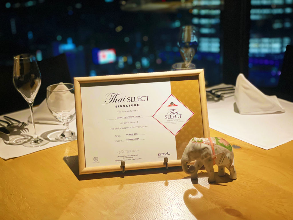 タイ国商務省の厳しい審査に合格したタイ・レストランに与えられる基準認定証、日本にいながら本場のタイ料理を味わえるレストランの証。その中でも、「タイ・セレクト・シグネチャー」とは、審査で5つ星にあたると評価されたレストランに与えられる認定です。