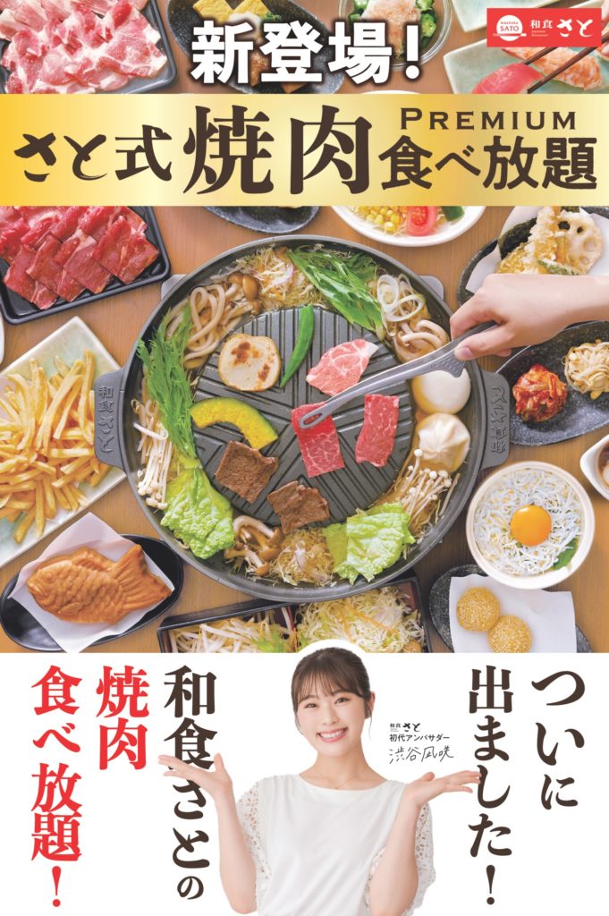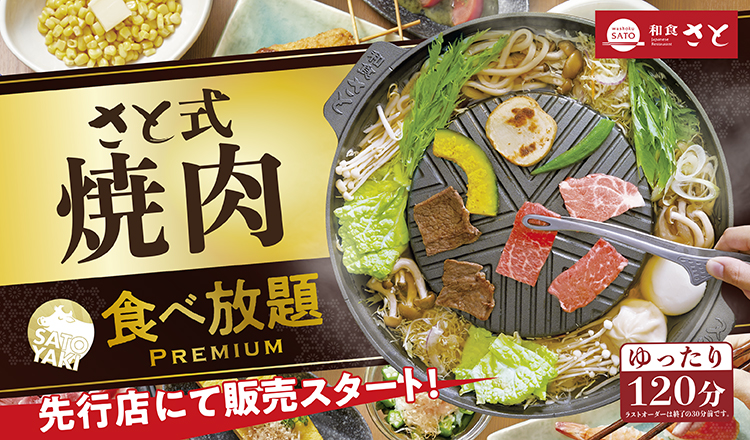 「さと式焼肉」は、和食さとの看板メニューであるしゃぶしゃぶ食べ放題「さとしゃぶ」・すき焼き食べ放題「さとすき」に続く新商品で、和食さとでしか体験できない新スタイルの「焼肉」食べ放題です。