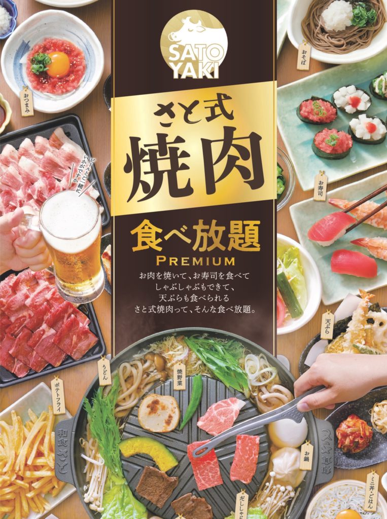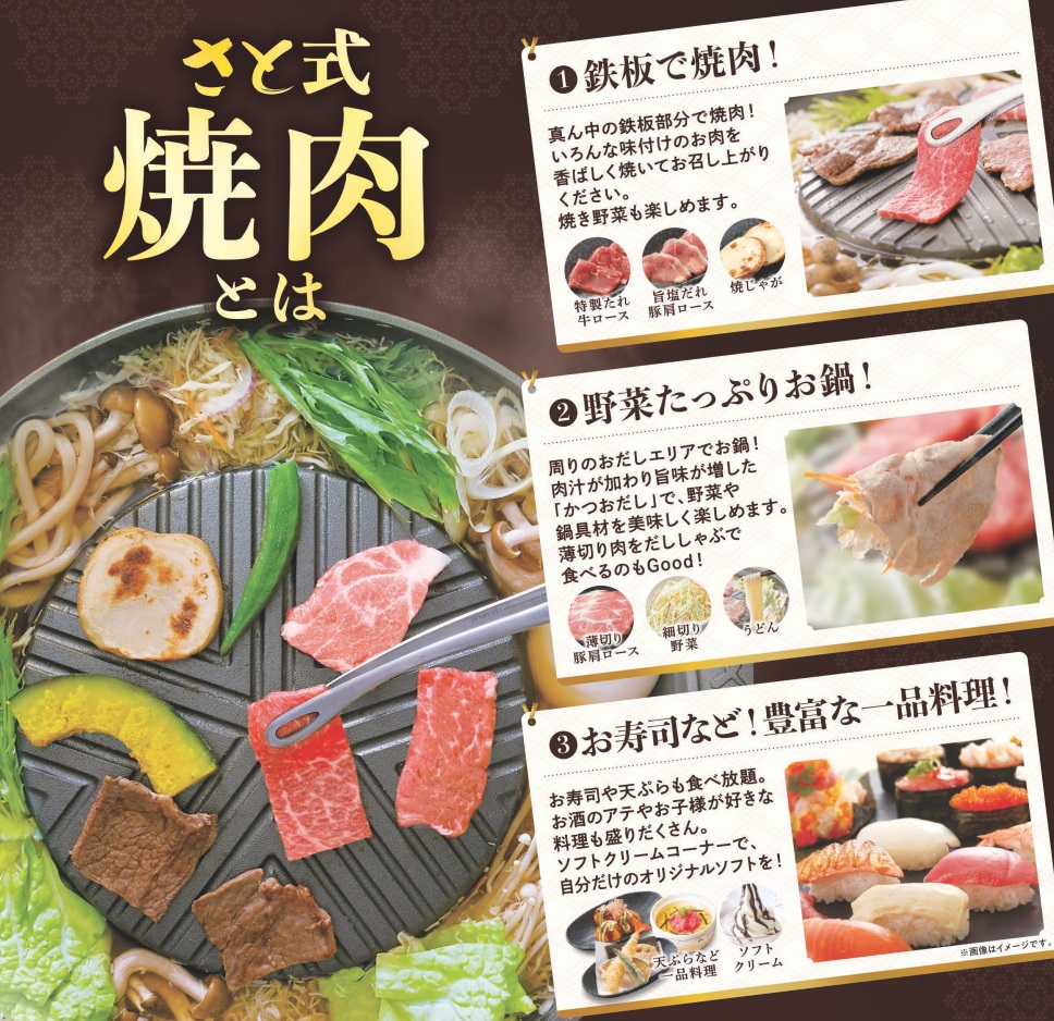 新商品「さと式焼肉」は、新スタイルの焼肉食べ放題で、「①中央の鉄板エリアで焼肉が食べ放題!②周りのお鍋エリアでしゃぶしゃぶ・野菜も食べ放題!③お寿司や海老天などの一品料理も食べ放題!」の3つが揃った、まさに和食さとだけでしか食べられない焼肉食べ放題です。