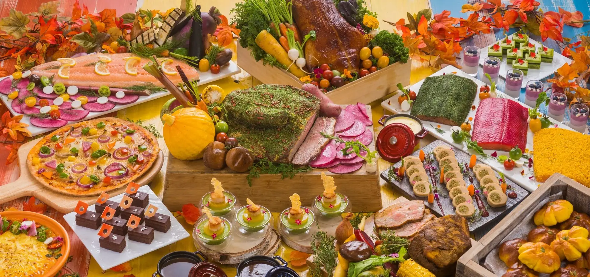 秋と言えば、収穫の秋、食欲の秋、芸術の秋。都会のリゾートとして親しまれているヒルトン福岡シーホークの開放的なアトリウム空間には、スイス人総料理長ゲハード・ガーバーとシアラのインターナショナルシェフ達が、見た目、香り、味覚、食感など多方面から秋の恵みを楽しんでいただこうと、約40種のお料理をご用意いたします。今回の注目は、3種のカービング料理。お客様の目の前で切り分け、ライブ感溢れる演出でご提供いたします。