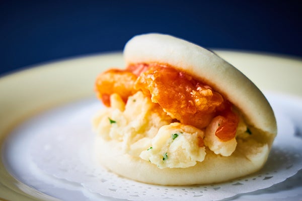 海老チリと北海道産のじゃがいもを使ったポテトサラダを蒸しパンでサンドした甘辛い味付けと海老の食感がたまらない一品です。