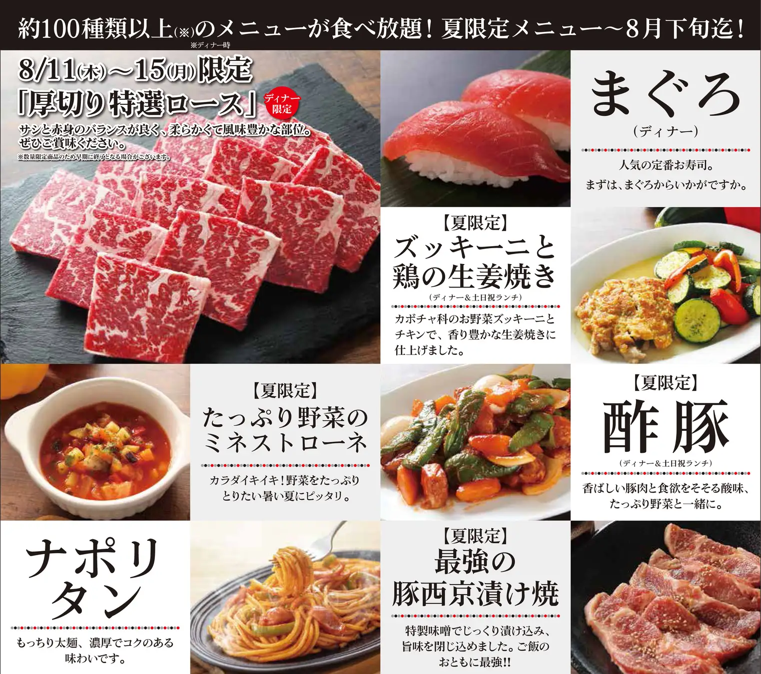 定番の焼肉、寿司各種のほか期間限定メニューも各種ご用意。