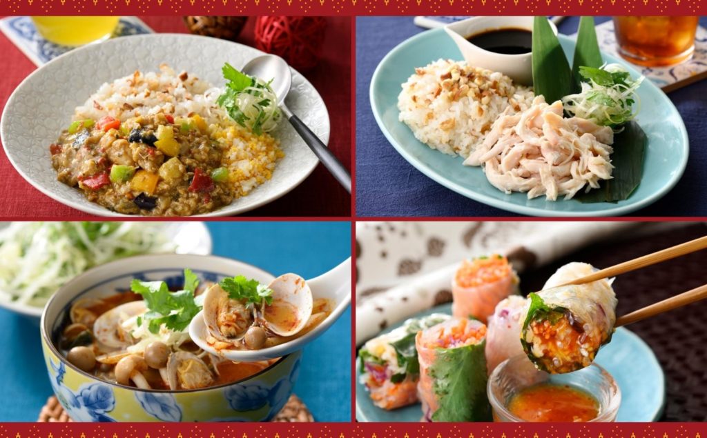 旅行先としても人気の高い『タイ』からは、エスニックな香りと甘辛い鶏挽肉がたまらない!食欲をそそる『ガパオライス』とさっぽり蒸し鶏とともに味わう『カオマンガイ』。屋台で人気の麺料理、後を引く酸味と辛味が特徴の旨辛スープの『トムヤムクン』などの定番メニューが勢ぞろい!