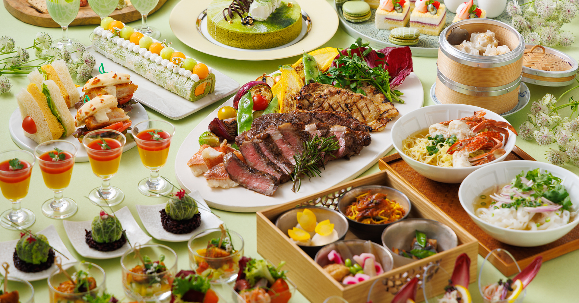 武藏窯で豪快に焼き上げられた肉や魚、逸品ワンプレート「浅草アミューズ」、テーブルに並べると華やかでフォトジェニックなオードブル、初夏の新緑をイメージしたグリーンカラーのスイーツブッフェがお楽しみいただけます。