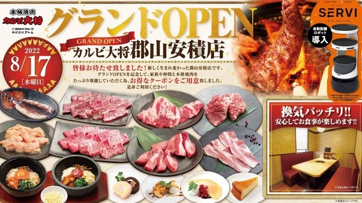 コロワイドグループである株式会社アトム(本社:神奈川県横浜市、代表取締役社長:山角豪 )は、本格焼肉「カルビ大将」を2022年8月17日(水)に福島県郡山市に出店します。総合居酒屋「和処ダイニング暖や」からの業態変更となり、3年ぶりの「カルビ大将」出店となります。