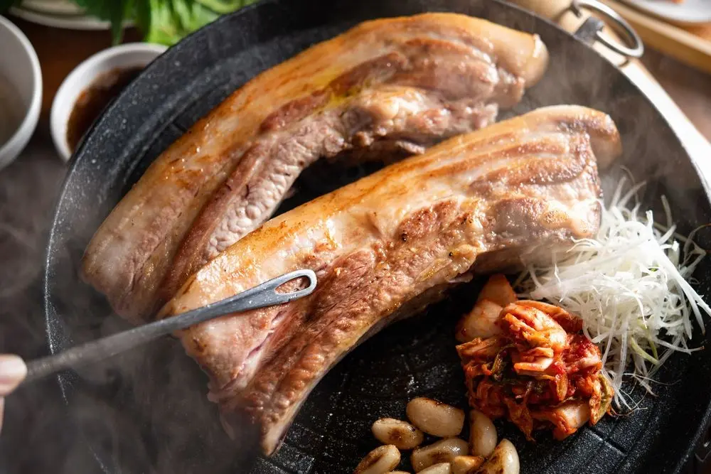 豚バラ、豚肩ロース、サニーレタス、サムジャン、パジョリ、キムチ、玉葱、青唐辛子、にんにく