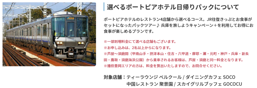 株式会社フォーティーズは「ふるさと応援!ひょうごを旅しようキャンペーン」の対象商品としてポートピアホテルのレストランとJR往復きっぷがセットになったパックツアーの期間延長分の販売を開始しました。