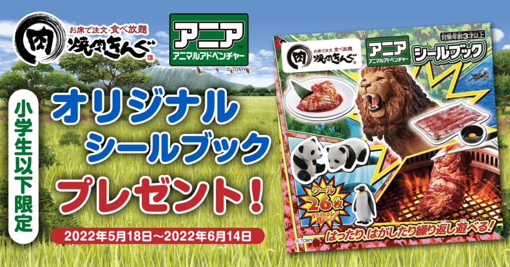 株式会社物語コーポレーションが、全国で282店舗展開中の『焼肉きんぐ』は、2022年5月18日(水)〜6月14日(火)の期間限定で、動物フィギュア「アニア アニマルアドベンチャー」(発売元:株式会社タカラトミー 以下「アニア」)とコラボレーションした、アニア「オリジナルシールブック」をプレゼントいたします。