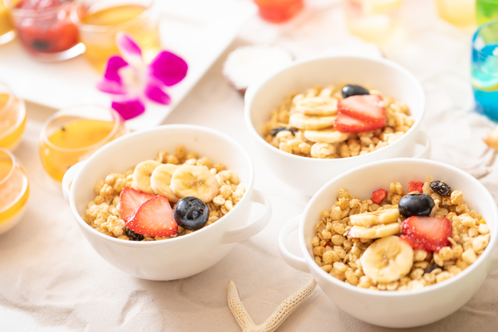 “ハワイアンパンケーキ”は、たっぷりの生クリーム、ホテルメイドのリリコイバターやグァバシロップ、濃厚なマカダミアナッツソースなどと一緒に楽しめる、シェフパティシエおすすめの一品です。その他、ハワイの定番デザート“アサイーボウル”や“パイナップルムース”など、全19種類のスイーツをご用意。フードは、ハワイの定番料理を料理長がストリングスホテル流にアレンジ。“ココナッツ香る 牛筋肉のカレー”や“ロコモコ風ショートパスタ”など、ボリューム感のあるメニューを食べ放題でお楽しみいただけます。