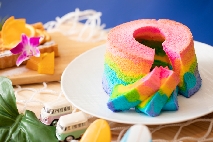 ハワイで幸運の象徴として愛されており、見ると幸せになれるといわれている“虹”をイメージした“レインボーシフォンケーキ”や、南国らしいトロピカルフルーツをつかったスイーツの数々で“常夏の島ハワイ”を堪能いただけます。