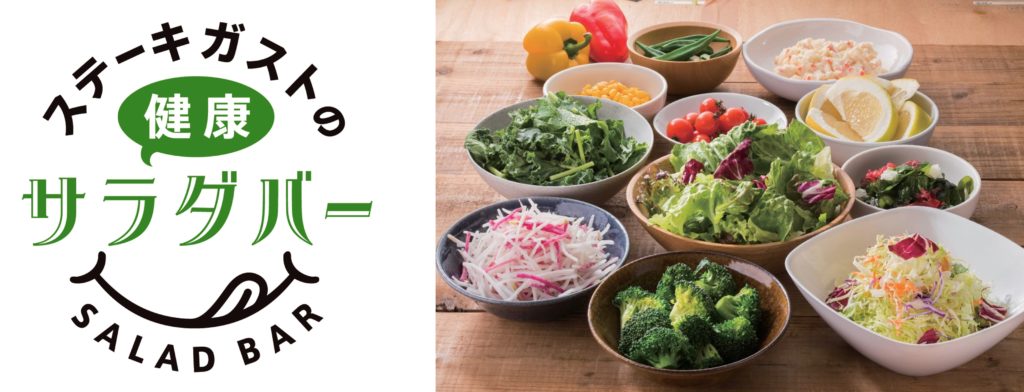 ステーキガストの全ての平日ランチメニューに、サラダ・日替わりカレー・パン・ライス・スープ・デザート等、約20種が食べ放題の健康サラダバーをつけることができます。