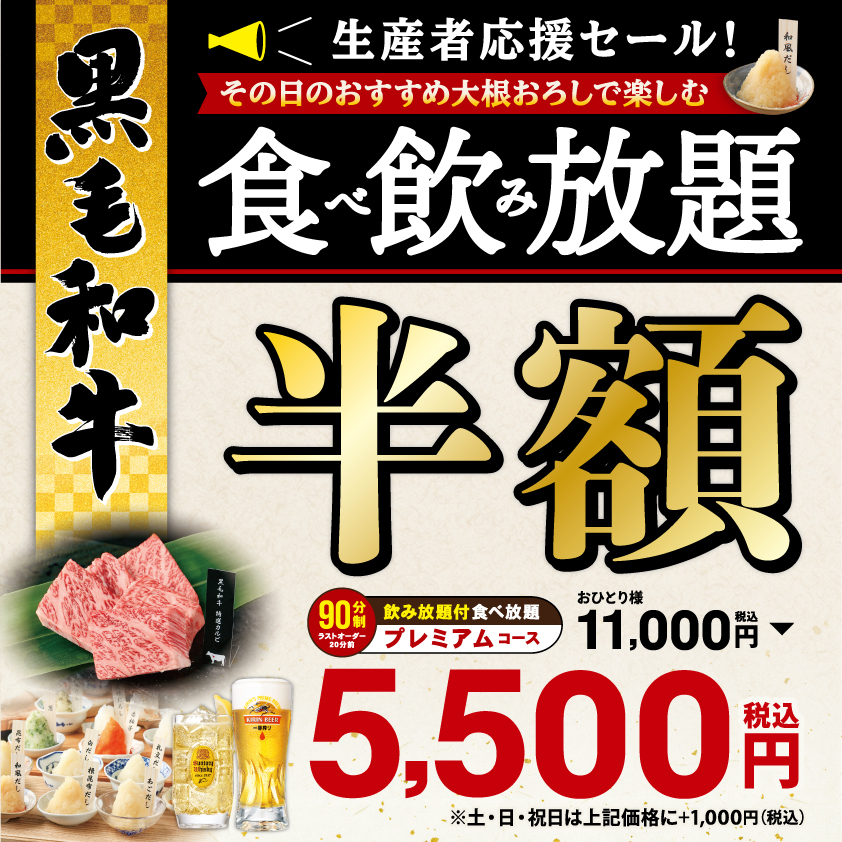 株式会社モンテローザ(本社:東京都武蔵野市)は、「焼肉X牛(やきにく エックスぎゅう)」(所在地:東京都新宿区歌舞伎町)で、その日の“おすすめ大根おろし”と共に楽しむ黒毛和牛を含む「焼肉食べ飲み放題プレミアムコース」を令和3年6月21日(月)から、通常価格11,000円を半額の5,500円にて販売。
