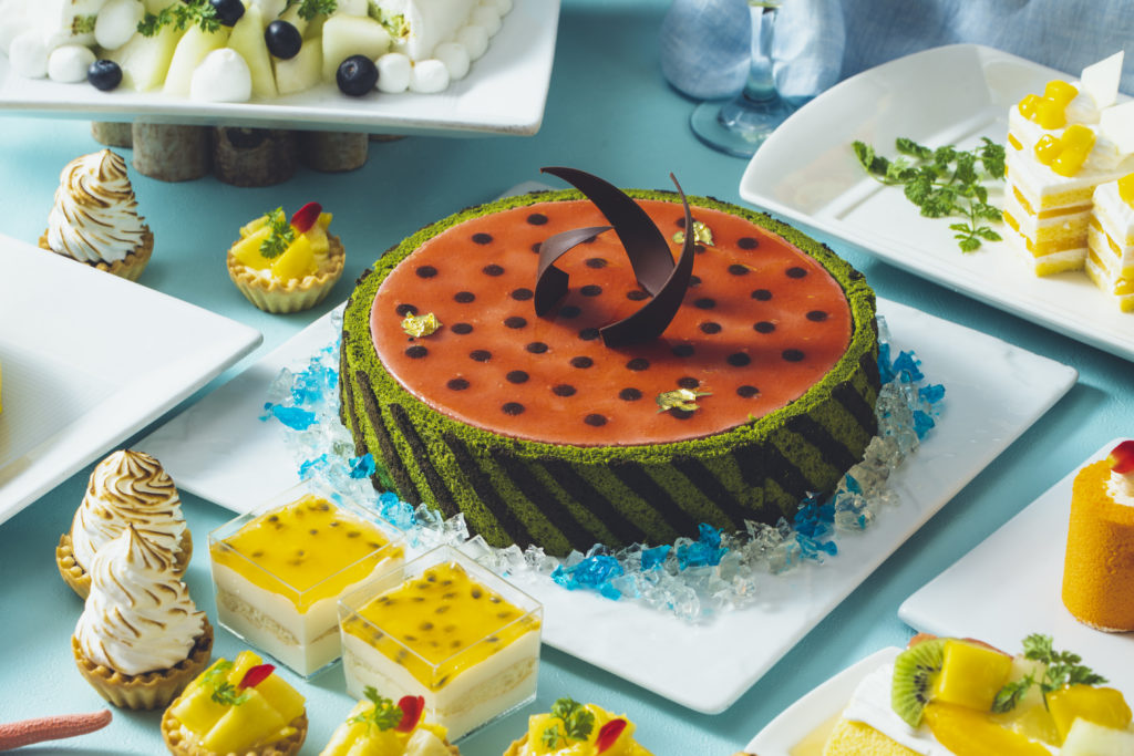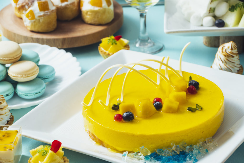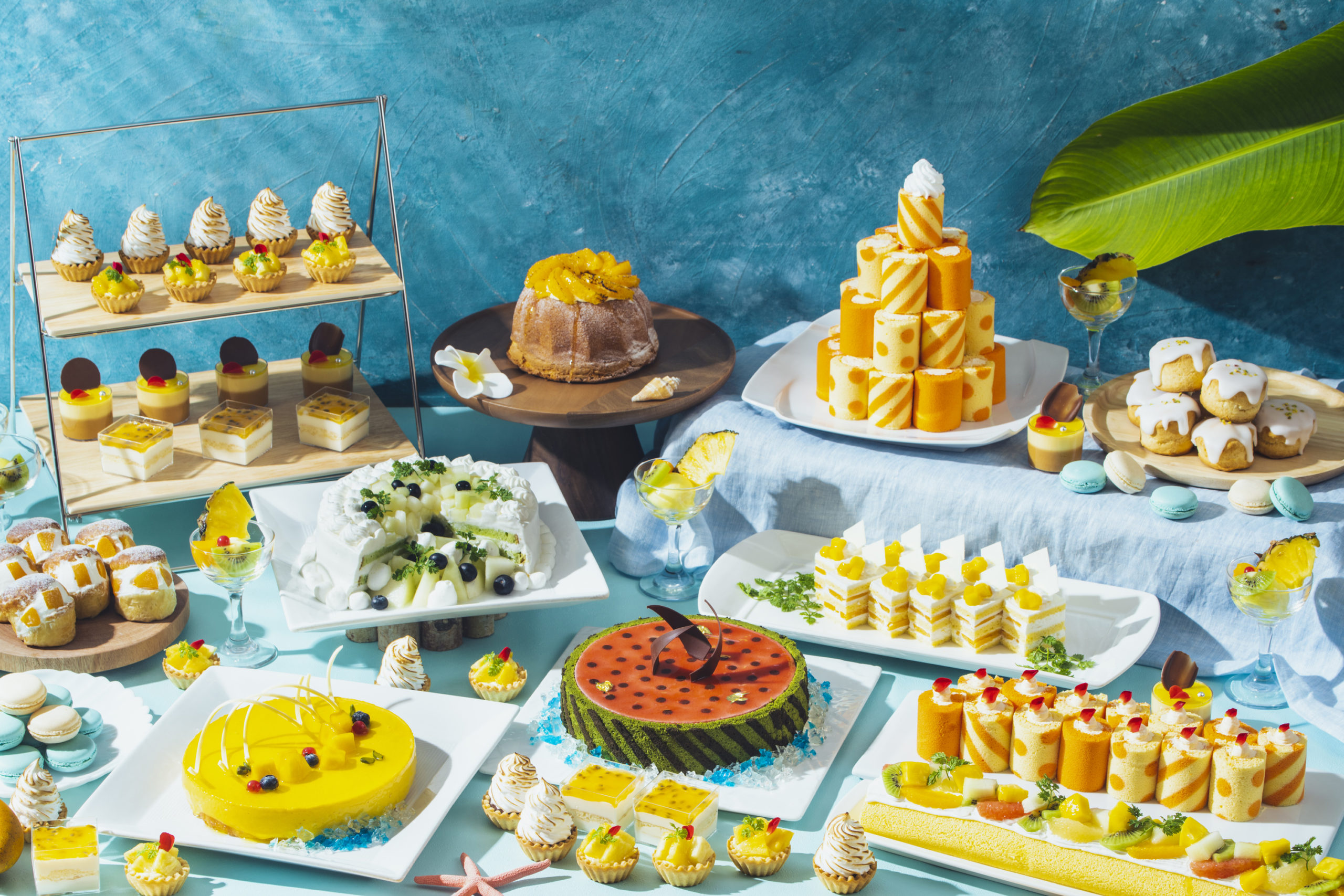 オールデイダイニング「グランドキャッスル カフェ&ダイニング」では四季に合わせスイーツビュッフェを提供し、今回は初夏をテーマに常夏の島「沖縄」で生産されたフルーツをふんだんに使用したスイーツをご用意いたします。心とお肌がトキメク、可愛いサマースイーツたちがビュッフェ台を彩ります。