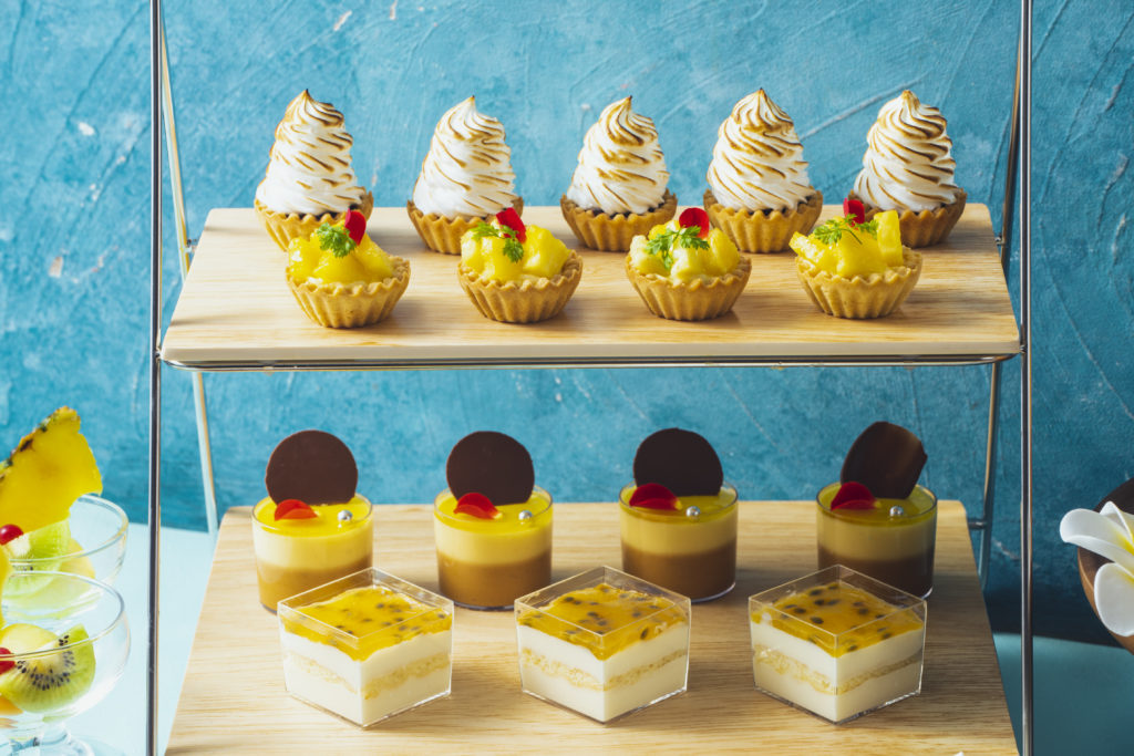 可愛らしい約15種類のスイーツのほか、「スイカのガスパチョ」、「マンゴーチャツネ入りカレー」や「鶏腿肉のロースト パッションフルーツソース」などサマーフルーツ・夏野菜を使用したシェフこだわりの軽食やコーヒー・紅茶・ソフトドリンクで約10種類のお飲み物で、お腹も心も満足いくまでお楽しみください。
